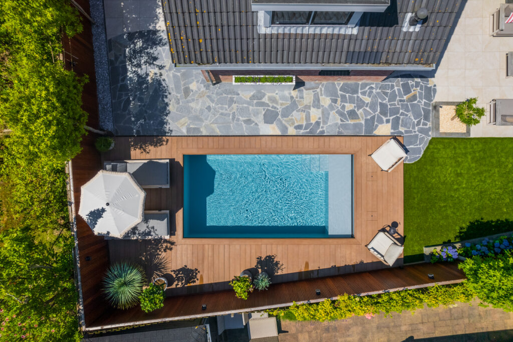 Die Position des Pools bestimmt nicht nur die Aussicht, sondern auch den Komfort. Möchten Sie uneingeschränkt die Sonne genießen? Oder wünschen Sie sich lieber einen Ort mit etwas mehr Schatten? Der Standort hat auch Einfluss auf die Wassertemperatur und den Wartungsbedarf.